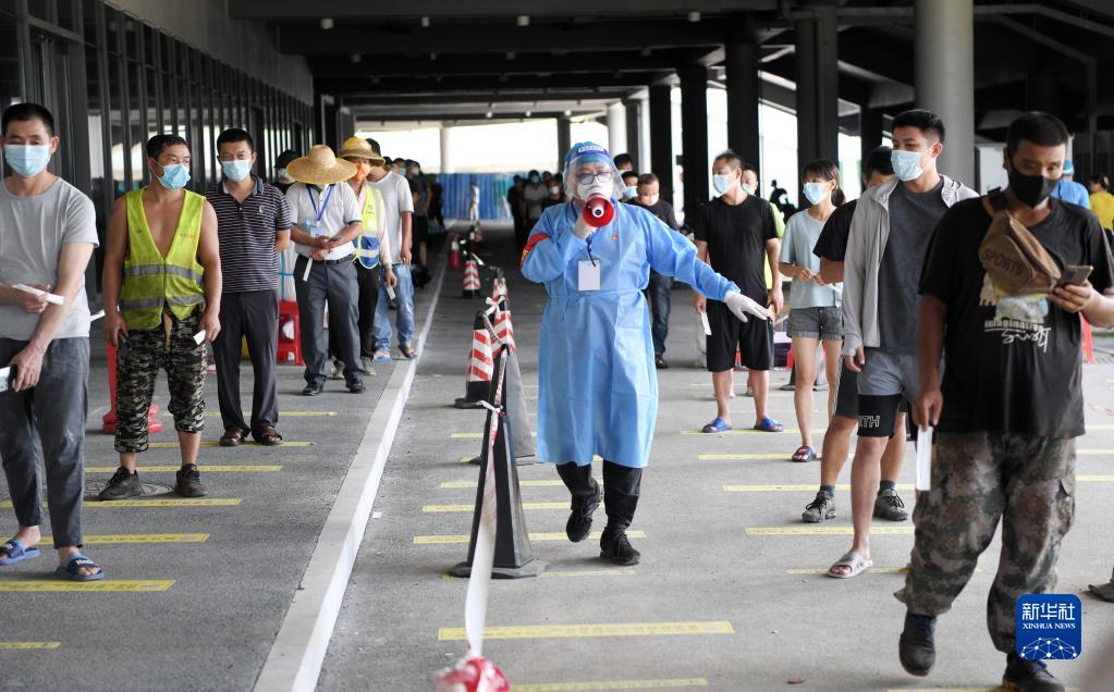 8月7日,志愿者在三亞國際體育產(chǎn)業(yè)園核酸采樣點(diǎn)服務(wù)。