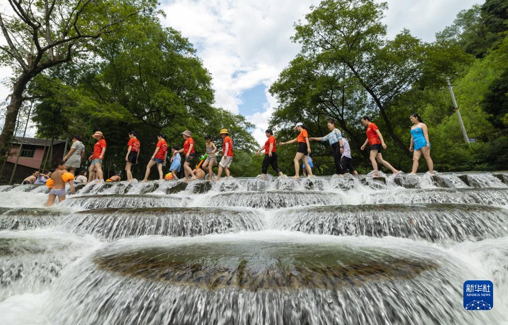 8月8日,湖南省懷化市通道侗族自治縣萬(wàn)佛山鎮木腳村,人們在壩間戲水。