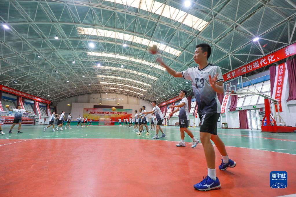 8月8日,河北省唐山市灤南縣灤南中學(xué)手球隊隊員在進(jìn)行傳球練習。