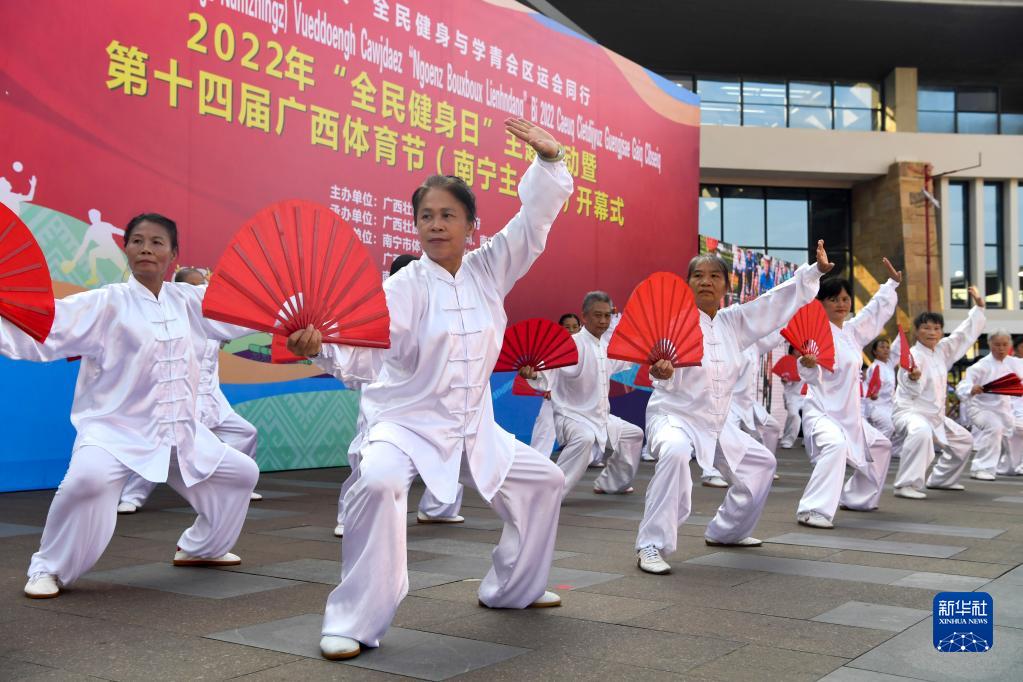 8月8日,全民健身項目展演人員在第十四屆廣西體育節開(kāi)幕式上表演太極扇。