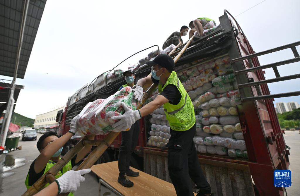 8月8日,在三亞一農副產(chǎn)品批發(fā)市場(chǎng),工作人員在搬運從島外運來(lái)的蔬菜。