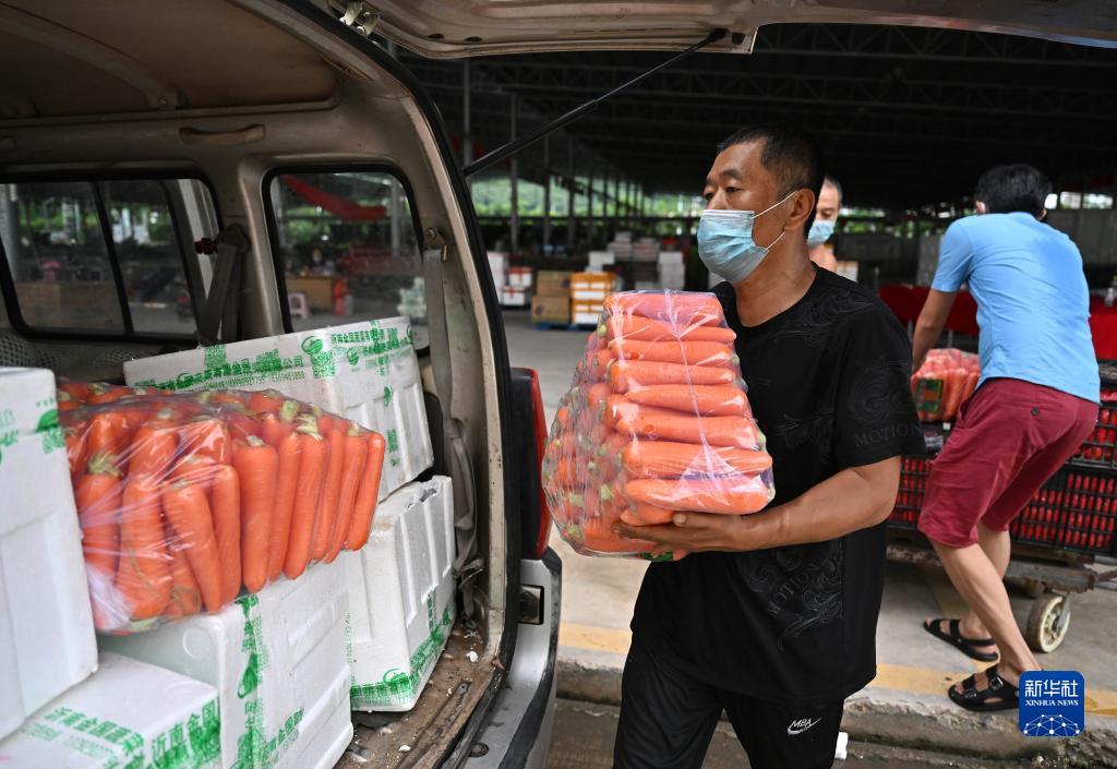 8月8日,在三亞一農副產(chǎn)品批發(fā)市場(chǎng),工作人員在裝運蔬菜。
