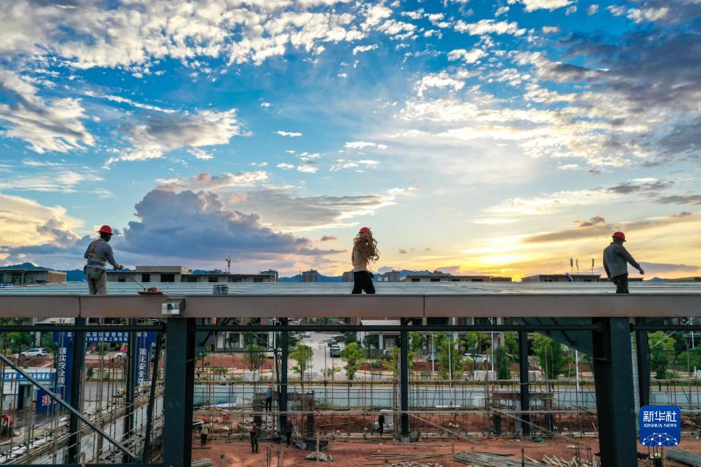 8月7日傍晚,在永州市藍山縣經(jīng)開(kāi)區創(chuàng )品國際智慧物流園項目建設現場(chǎng),工人在施工(無(wú)人機照片)。