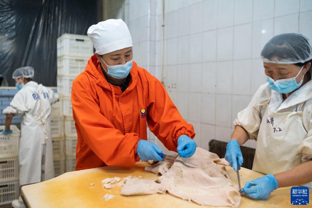 8月4日,崔玉梅(中)與同事在車(chē)間一起精修牛副產(chǎn)品。