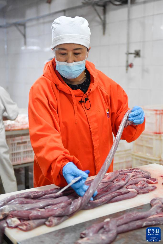 崔玉梅在加工車(chē)間內進(jìn)行牛副產(chǎn)品精修工作(8月4日攝)。