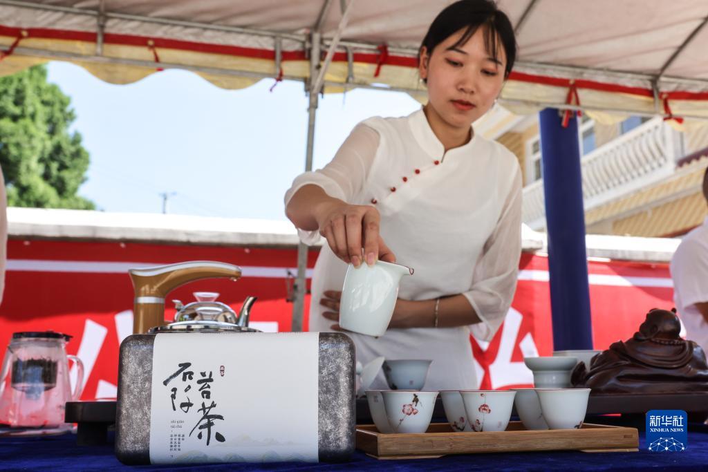 8月9日,工作人員在石阡縣楓香鄉梨子園村茶葉加工廠(chǎng)內沖泡茶葉。