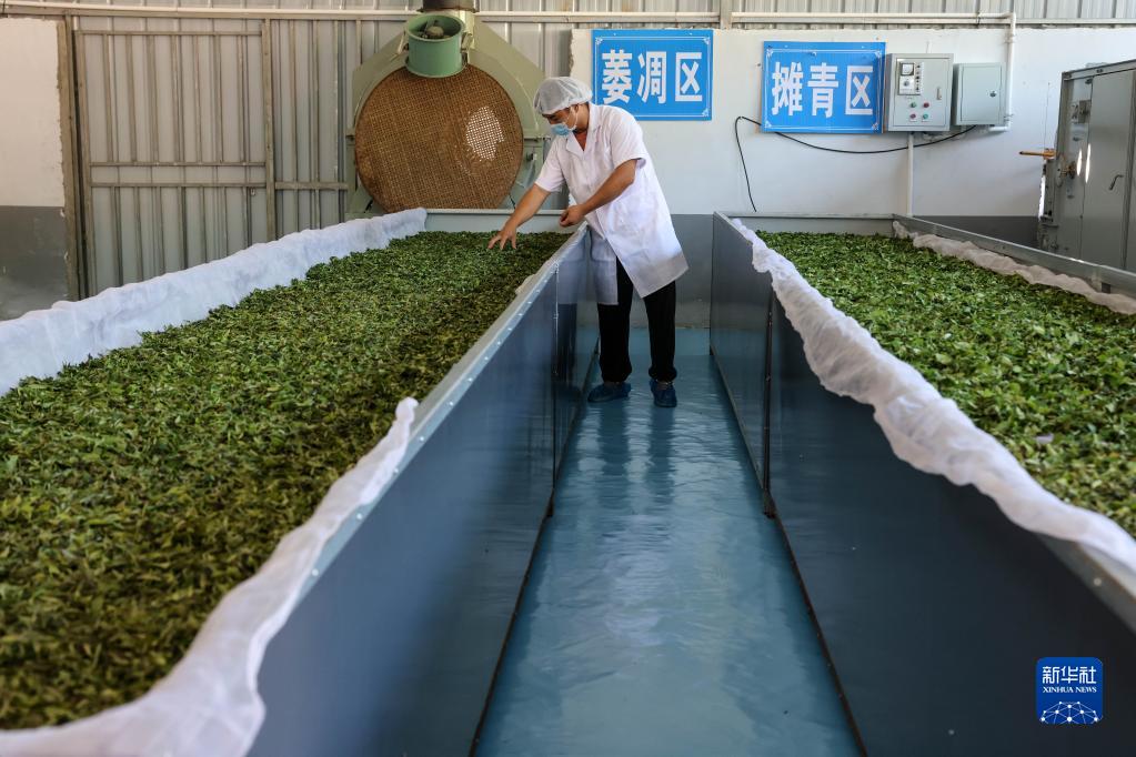 8月9日,工作人員在石阡縣楓香鄉梨子園村茶葉加工廠(chǎng)內對茶葉進(jìn)行萎凋。