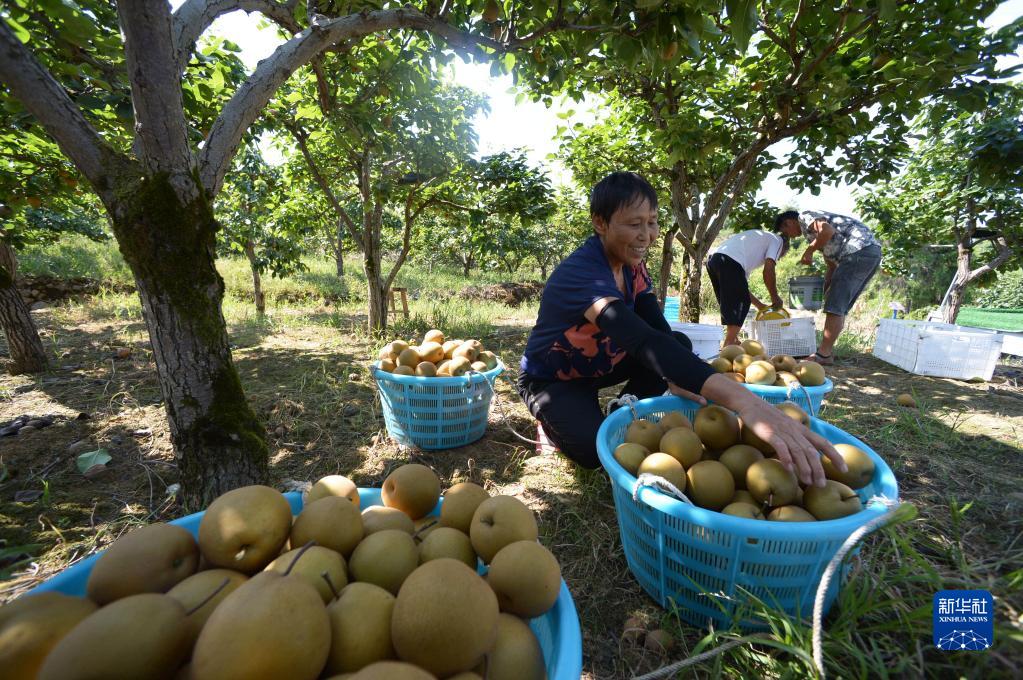 8月9日,村民在貴州省遵義市余慶縣白泥鎮明星社區果園分揀剛采摘的金秋梨。