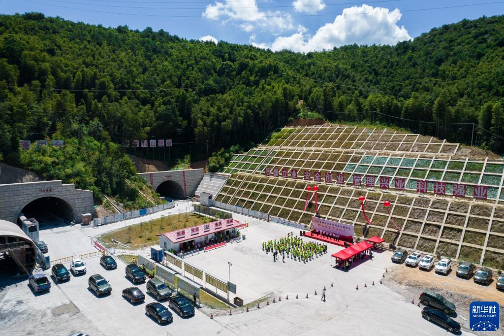 8月9日在衡永高速祁山隧道洞口拍攝的隧道貫通儀式(無(wú)人機照片)。