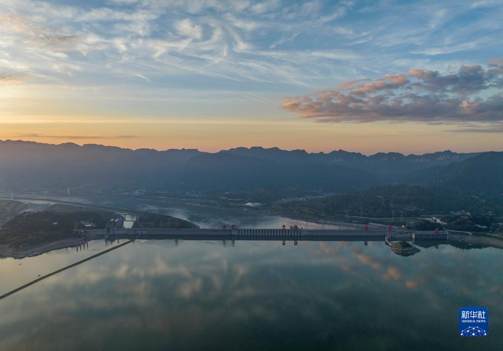日出時(shí)分,在湖北省宜昌市秭歸縣,朝霞把長(cháng)江三峽大壩裝扮得美不勝收(8月9日,無(wú)人機照片)。