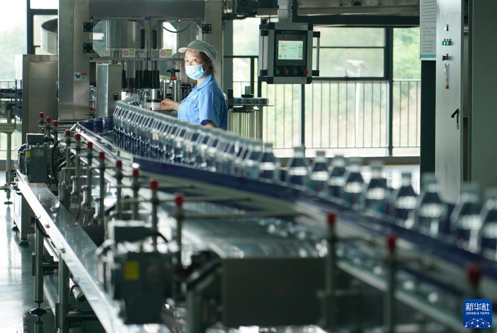 工人在陜西省漢陰縣一家包裝飲用水公司生產(chǎn)車(chē)間內作業(yè)(2021年6月2日攝)。