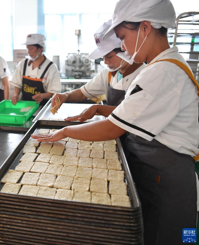 8月9日,陜西省漢陰縣一家食品加工企業(yè)的工人在制作當地特色小吃“炕炕饃”的方便食品。