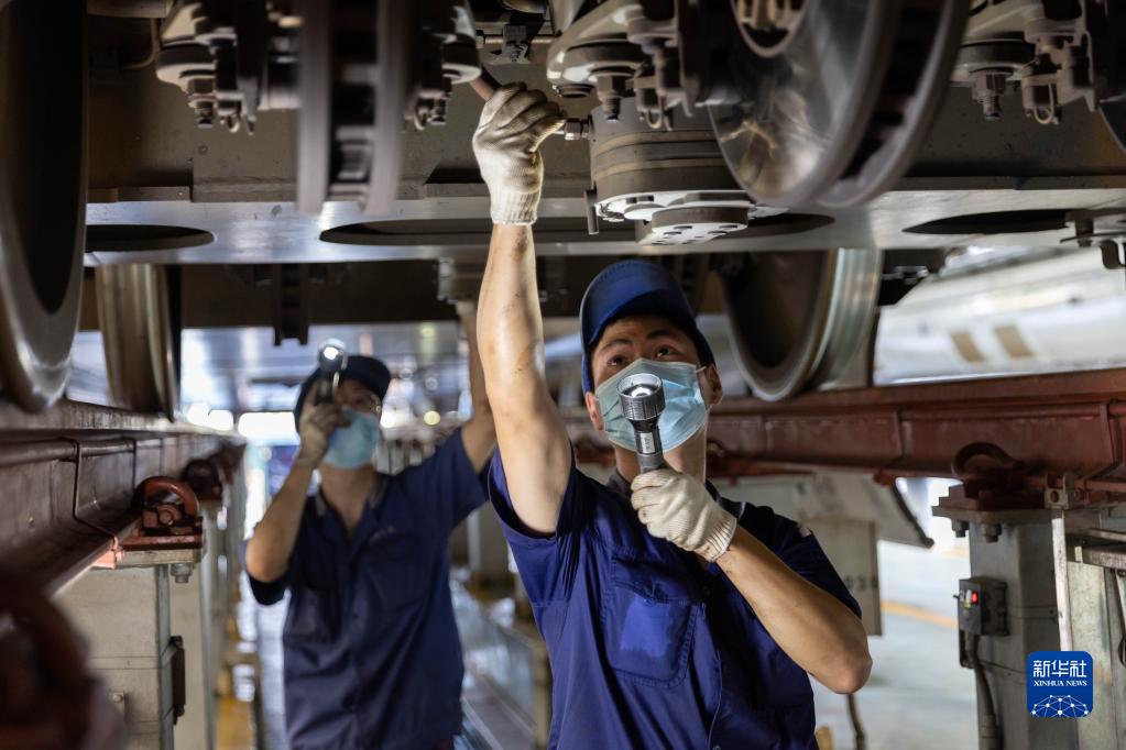 8月10日,動(dòng)車(chē)組機械師對動(dòng)車(chē)組轉向架進(jìn)行檢查。 新華社記者 王翔 攝