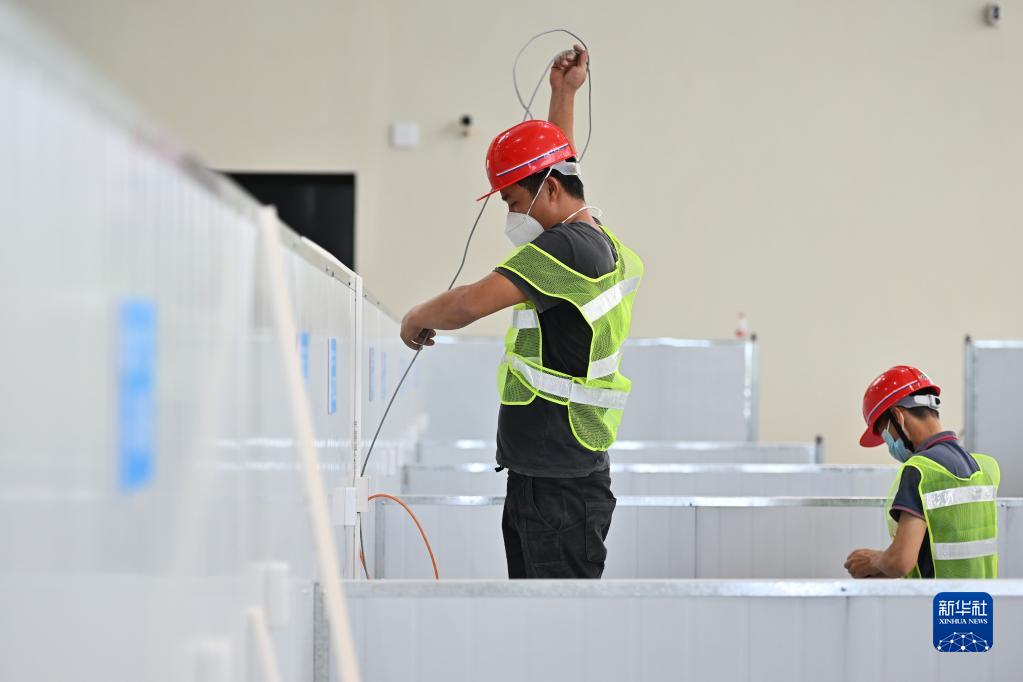 8月10日,工人在三亞第二方艙醫院作業(yè)。