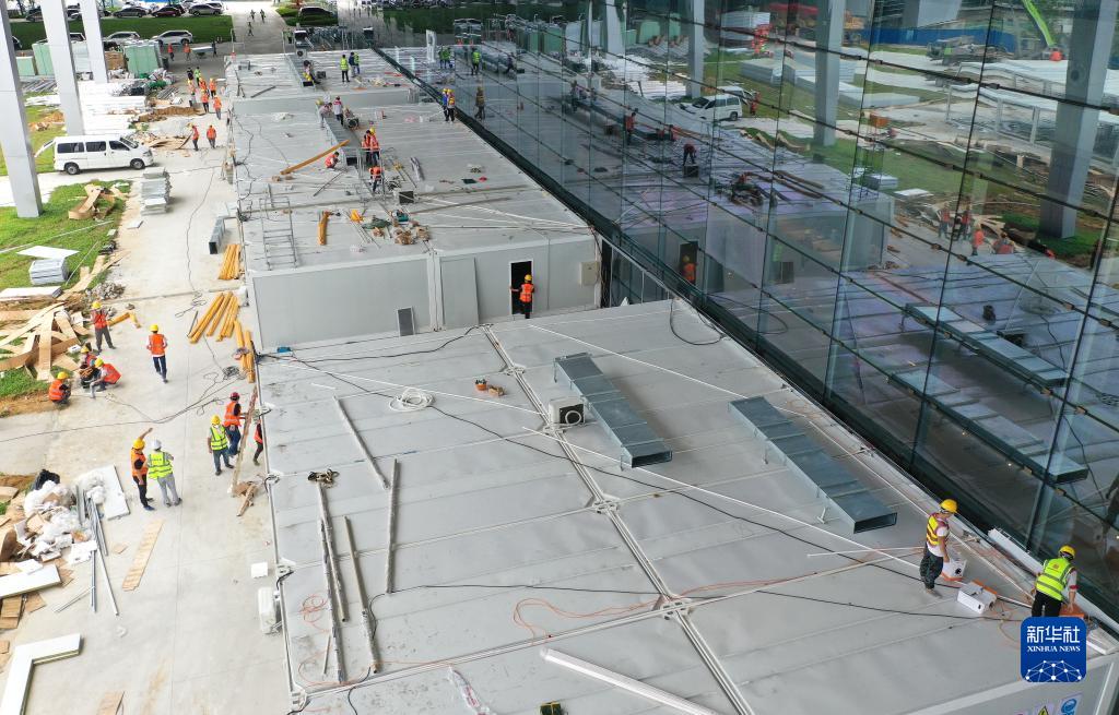 8月10日,工人在三亞第二方艙醫院作業(yè)(無(wú)人機照片)。