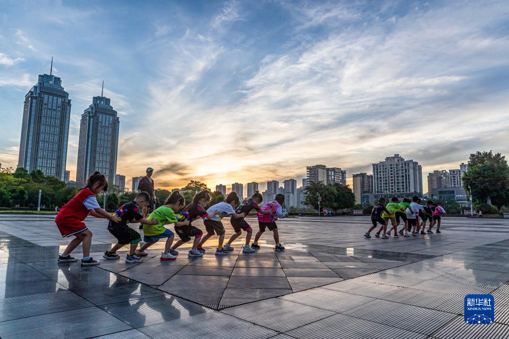 8月10日,小朋友在重慶市南川區市民廣場(chǎng)學(xué)習輪滑基本動(dòng)作。