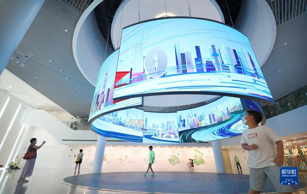 8月11日,參觀(guān)者觀(guān)看上海城市規劃展示館的“上海印象”城市畫(huà)卷環(huán)形巨幕。