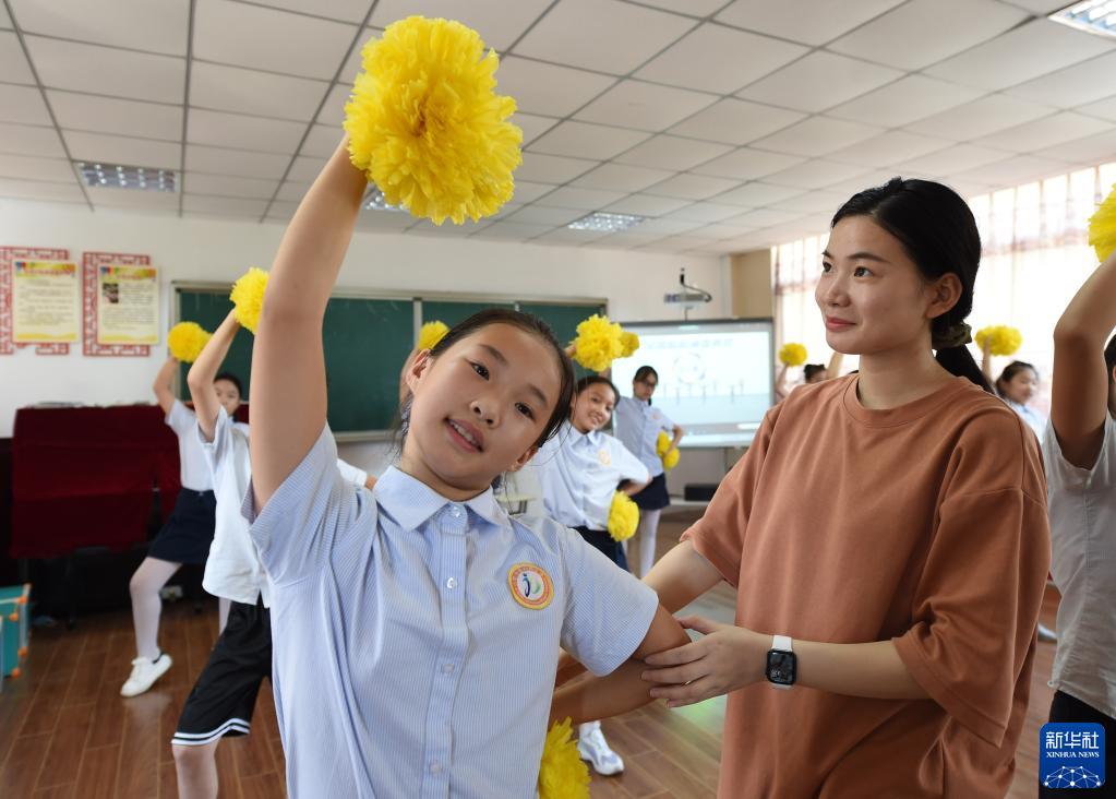8月11日,在合肥市蜀新苑小學(xué)暑期托管班里,學(xué)生在老師指導下學(xué)習啦啦操。
