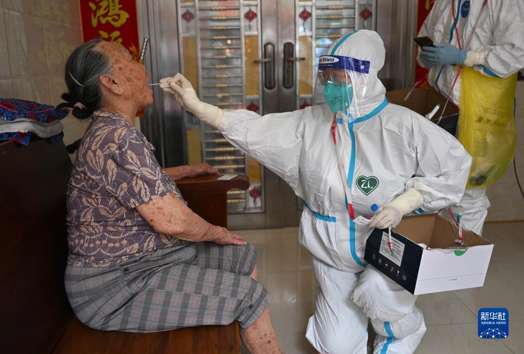 8月11日,河南省援海南三亞醫療隊的醫護人員李娟(右)在三亞市天涯區南邊海漁村為行動(dòng)不便的老人進(jìn)行入戶(hù)核酸采樣。