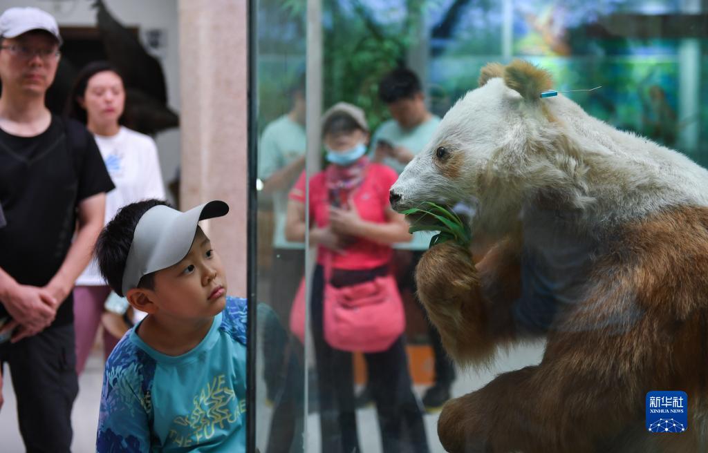 8月11日,在陜西漢中佛坪秦嶺人與自然博物館,研學(xué)團隊的小朋友在觀(guān)察大熊貓標本。