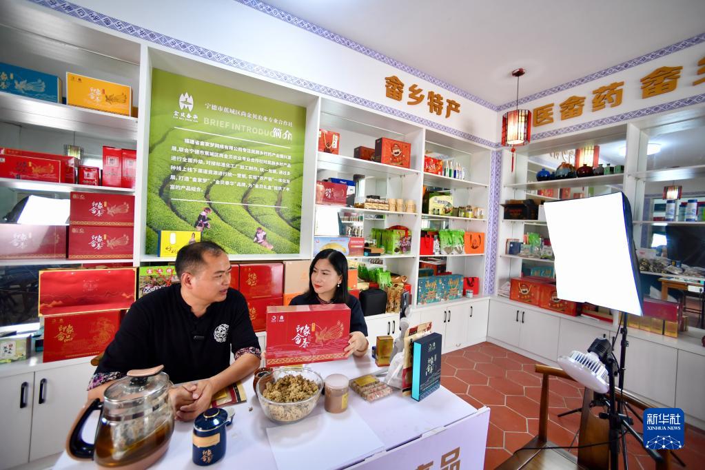 在福建省寧德市蕉城區金涵鄉上金貝村的直播間,上金貝村黨支部書(shū)記蘭春華(左)在與主播向網(wǎng)友推介家鄉特產(chǎn)(8月11日攝)。