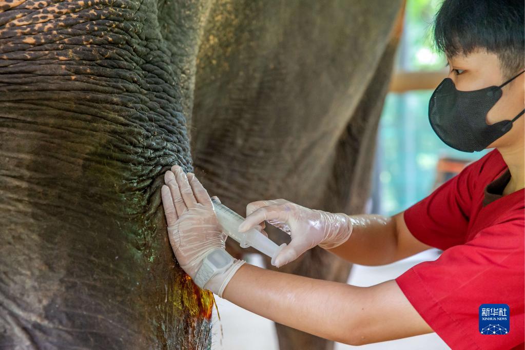 8月6日,在泰國南邦府“亞洲象之友”大象醫院,獸醫給一頭受傷的大象打針。