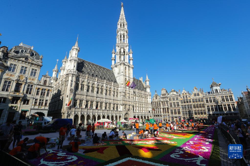 8月12日,工作人員在比利時(shí)布魯塞爾大廣場(chǎng)鋪裝“鮮花地毯”。