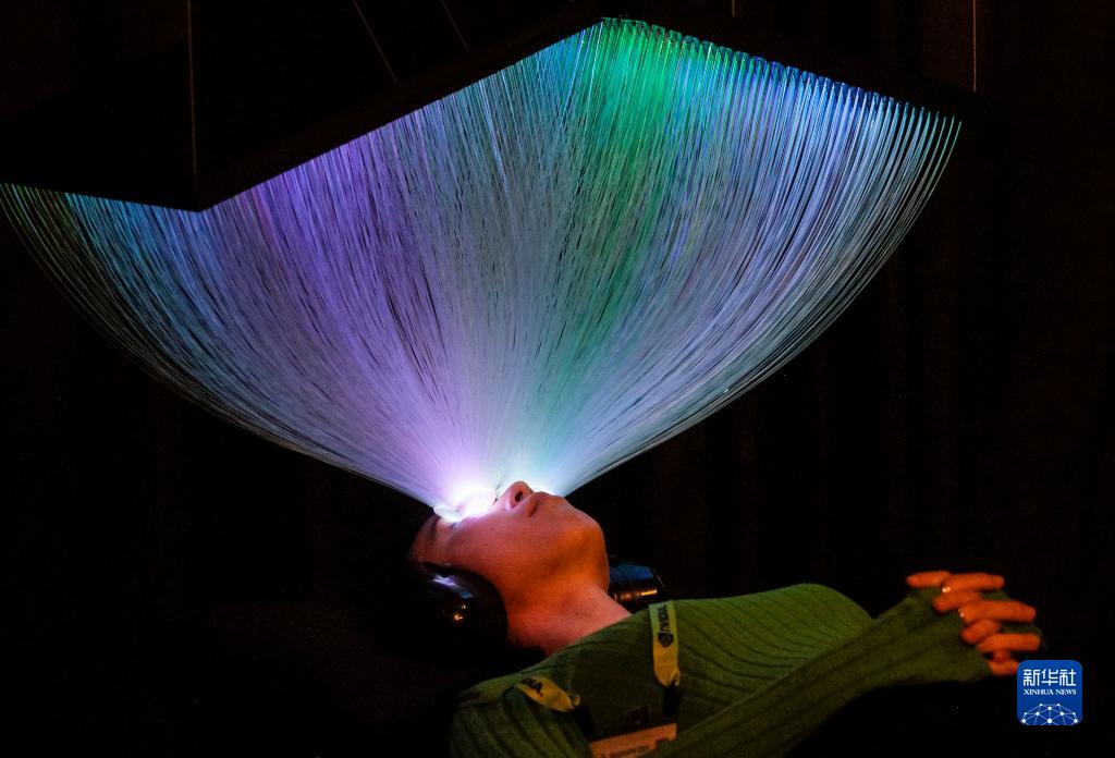 8月9日,在加拿大溫哥華舉行的SIGGRAPH 2022年會(huì )上,參觀(guān)者體驗一款可將顏色與光線(xiàn)通過(guò)光纖投射到眼瞼上的設備。