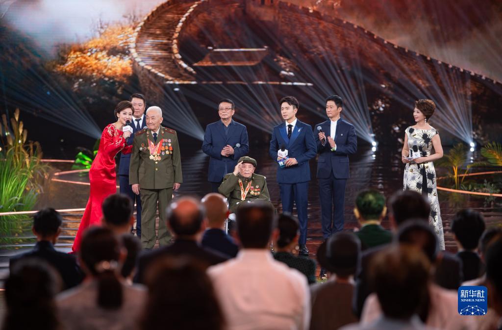 8月12日,電影《長(cháng)津湖》劇組成員于冬、黃建新、吳京(左二、四、七)與抗美援朝老兵梅門(mén)造(左三)、何宗光(左五)在開(kāi)幕式“特別榮譽(yù)”環(huán)節上。