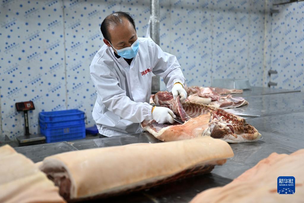 8月13日,三亞美菜網(wǎng)配送網(wǎng)點(diǎn)的工作人員在處理冷鮮肉。