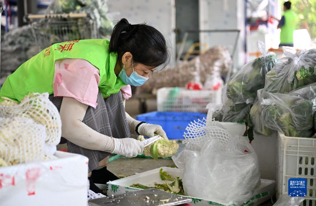 8月13日,三亞美菜網(wǎng)配送網(wǎng)點(diǎn)的工作人員在處理蔬菜。