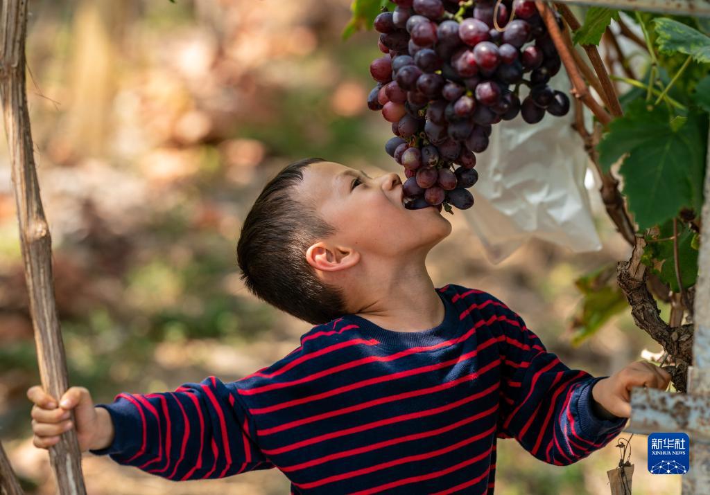 小朋友在東風(fēng)農場(chǎng)的葡萄架下吃葡萄(8月8日攝)。