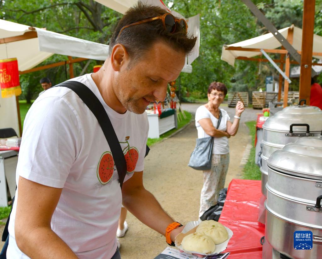 8月13日,在德國柏林世界公園,一名男子在中國展區選購包子。