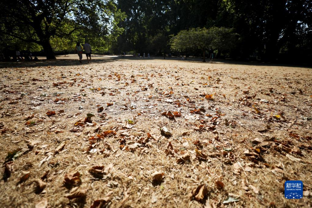 8月13日,在英國倫敦圣詹姆斯公園,人們走過(guò)枯黃的草地。