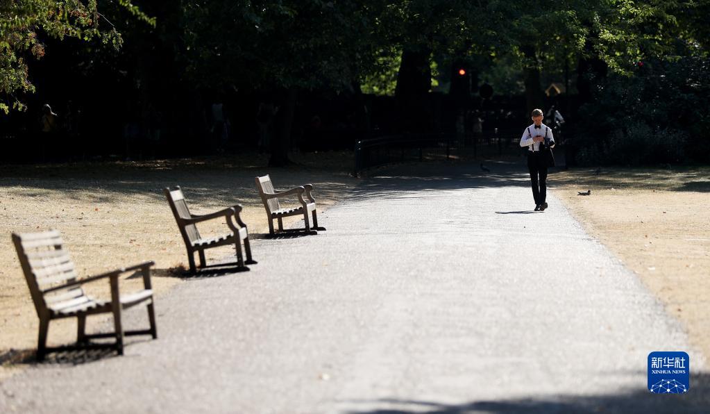 8月13日,在英國倫敦圣詹姆斯公園,一名男子從枯黃的草地旁走過(guò)。