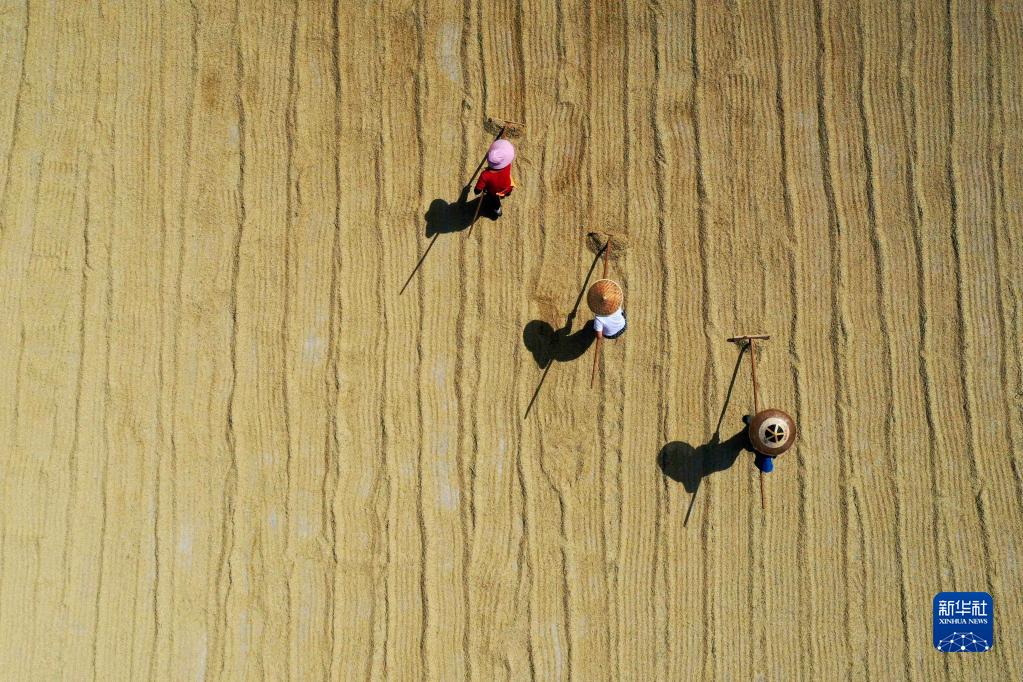 8月14日,村民在貴州省黔東南苗族侗族自治州岑鞏縣思旸鎮坪壩村晾曬種稻(無(wú)人機照片)。