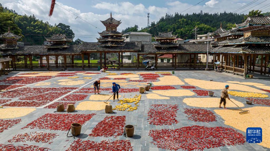 立秋過(guò)后,貴州高原鄉村處處曬秋忙。玉米、辣椒、稻谷、黃豆等農作物晾曬在農家房前屋后,與周?chē)鷦e具特色的田園風(fēng)光融為一體,繪就出一幅幅美麗的豐收圖景。