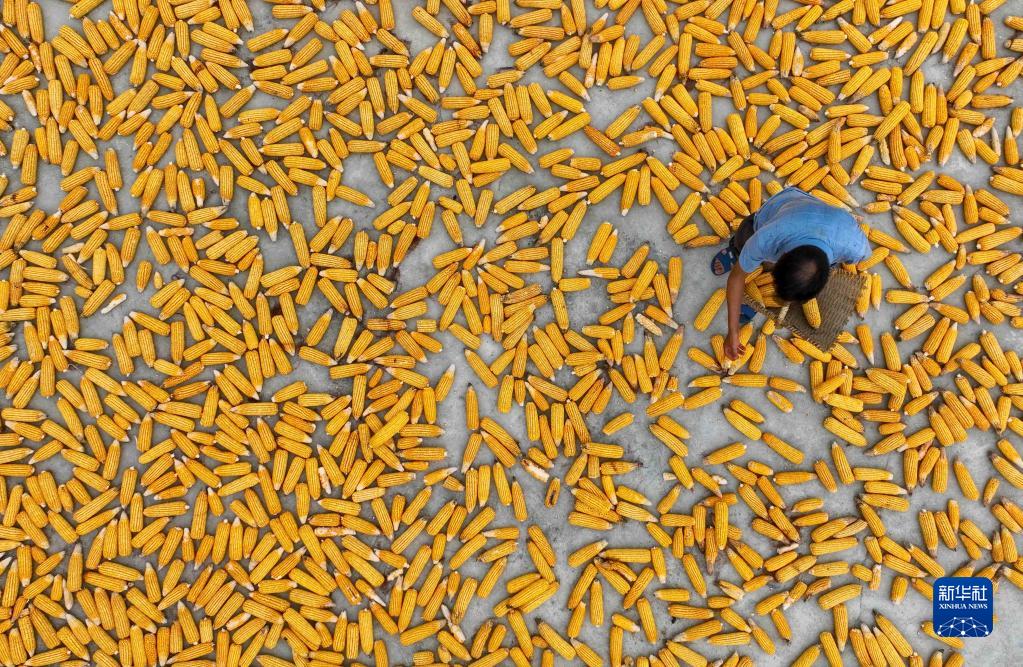 8月14日,村民在貴州省綏陽(yáng)縣風(fēng)華鎮金承社區晾曬玉米(無(wú)人機照片)。