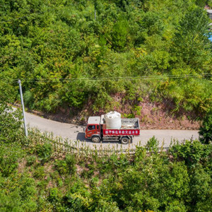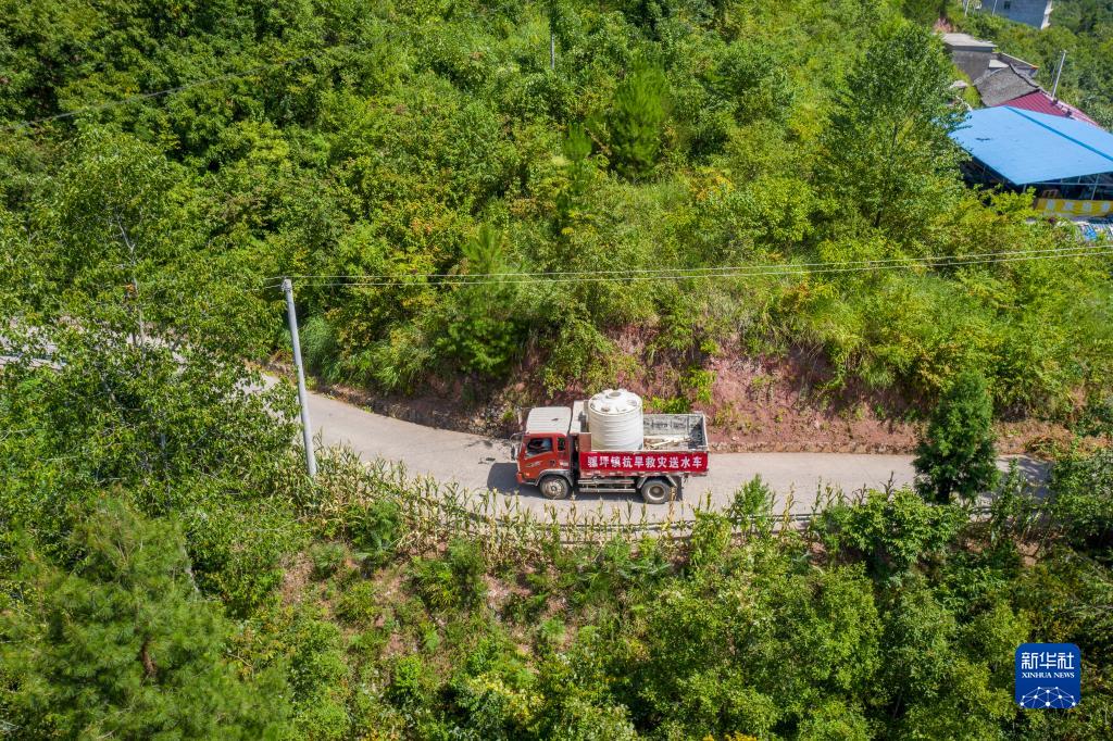 8月13日,在重慶市巫山縣騾坪鎮騾坪村,送水車(chē)行駛在山路上(無(wú)人機照片)。