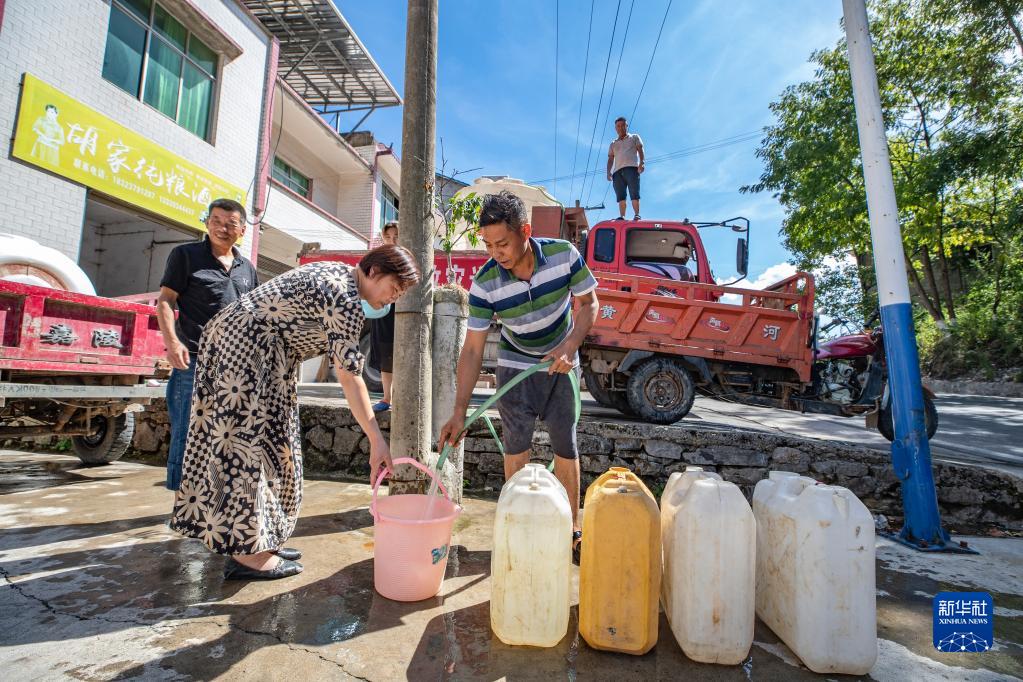 8月13日,在重慶市巫山縣騾坪鎮騾坪村,村民在集中供水點(diǎn)取水。