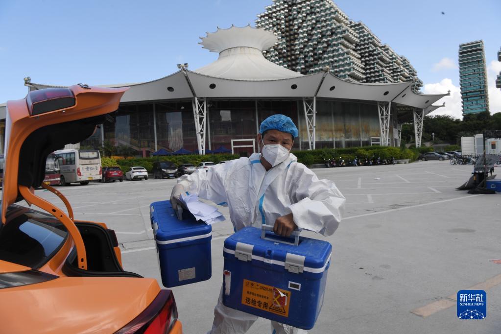 8月14日,在位于三亞市美麗之冠大劇院的核酸樣本轉運點(diǎn),志愿者轉運核酸樣本。