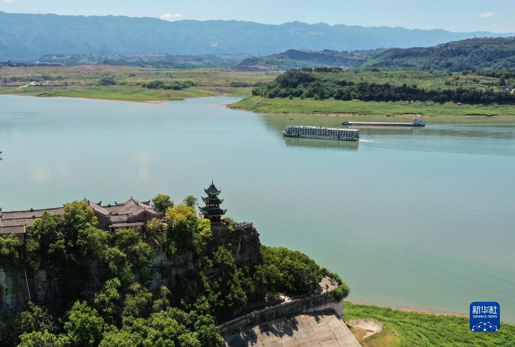 滿(mǎn)載貨物的滾裝貨船民快輪駛過(guò)重慶市忠縣石寶寨(8月8日攝,無(wú)人機照片)。