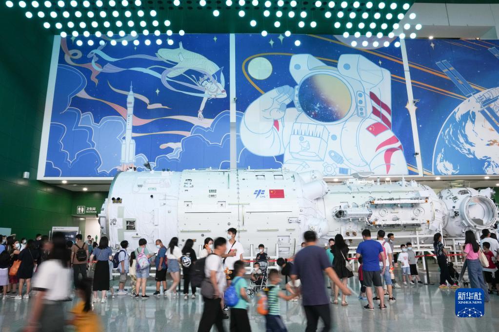 8月14日,在中國科學(xué)技術(shù)館,市民參觀(guān)展示的“天和”核心艙結構件。