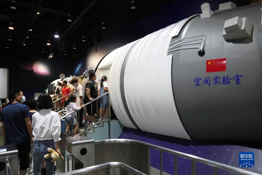8月14日,在中國科學(xué)技術(shù)館,參觀(guān)者排隊參觀(guān)神舟飛船和空間實(shí)驗室大型仿真模型。