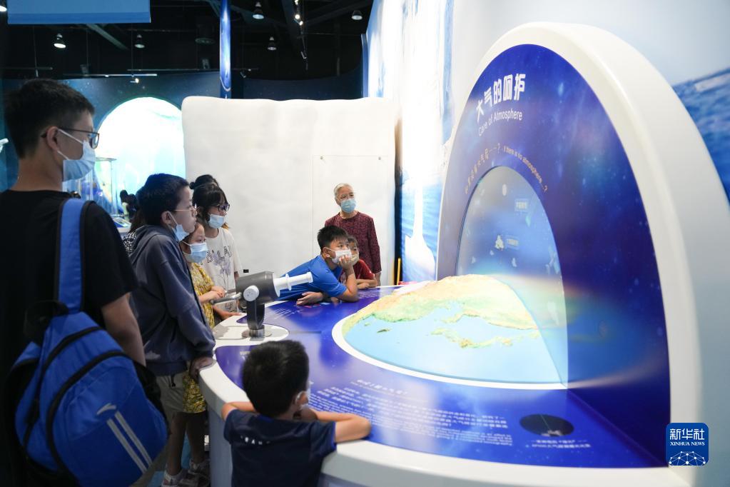 8月14日,在中國科學(xué)技術(shù)館,小朋友和家長(cháng)在參觀(guān)名為“大氣的呵護”裝置。