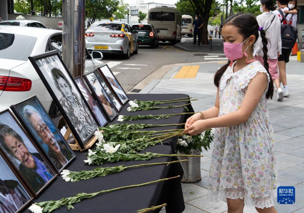 8月14日,在韓國首爾舉行的日軍“慰安婦”受害者紀念日活動(dòng)上,一名兒童在“慰安婦”受害者的照片前獻花。