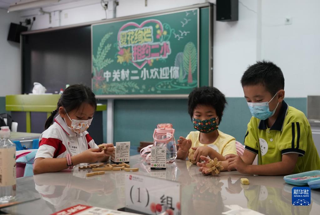 8月15日,北京市海淀區中關(guān)村第二小學(xué)(華清校區),參加暑期托管班的學(xué)生在自由活動(dòng)時(shí)間玩“孔明鎖”。