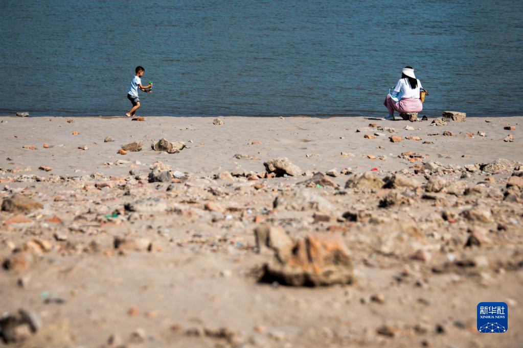 8月15日,武漢市民在漢口江灘灘涂游玩。