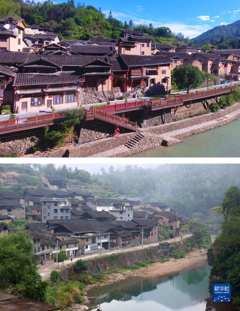 這是一張拼版照片。上圖為2022年6月23日拍攝的下黨村(無(wú)人機照片,新華社記者周義攝);下圖為2014年10月22日拍攝的下黨村(新華社記者姜克紅攝)。