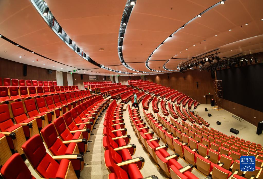建設者在香港科技大學(xué)(廣州)報告廳內檢查設備(8月16日攝)。
